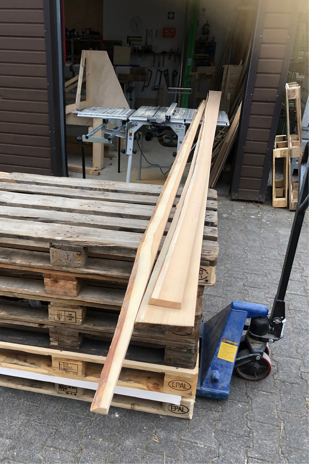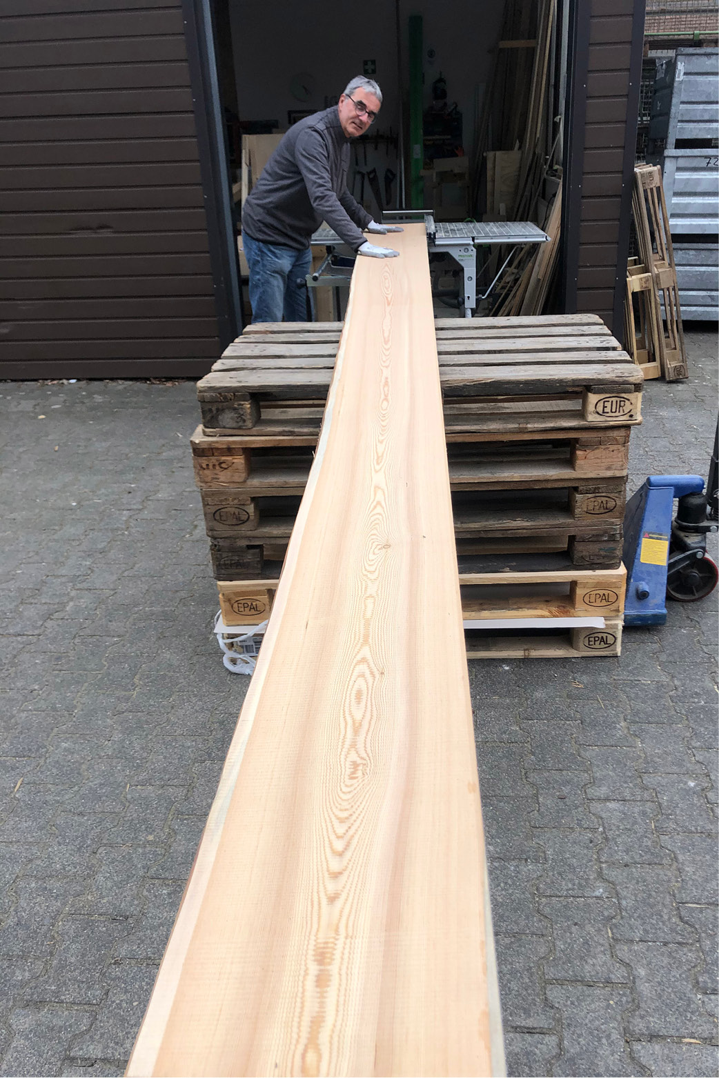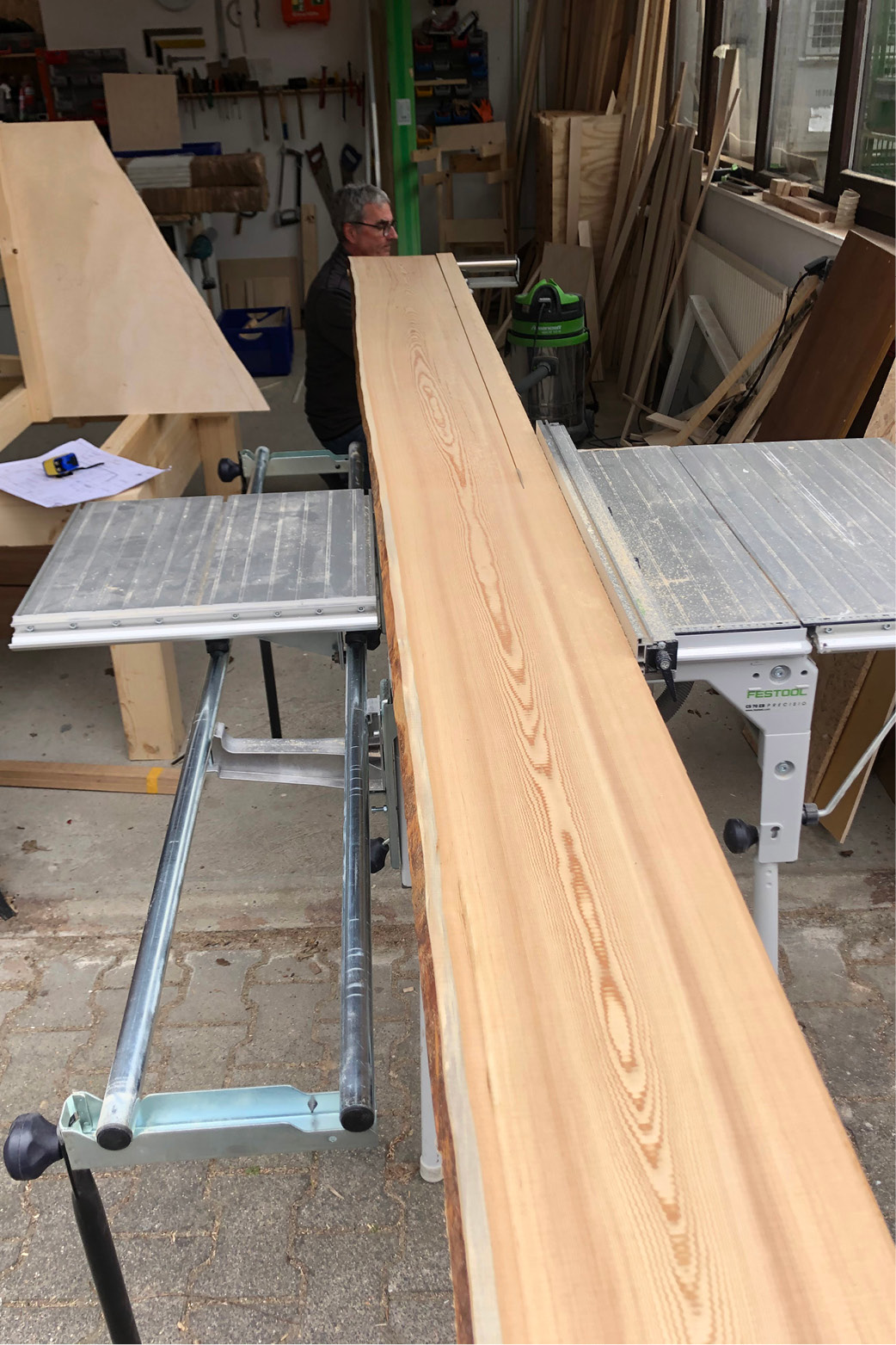 Lärche sieht toll aus. Geliefert wurden ca 25mm dicke Bretter, die den Stamm abbilden. Ich dachte, daß muß ich da irgendwie drandängeln. Weit gefehlt....erst wird noch gehobelt und dann das Holz aufgeschnitten....siehe Teileliste. Und lang sind die Dinger ....ca 550 cm. Einfach mal ins Auto legen ist da nicht ganz so einfach....