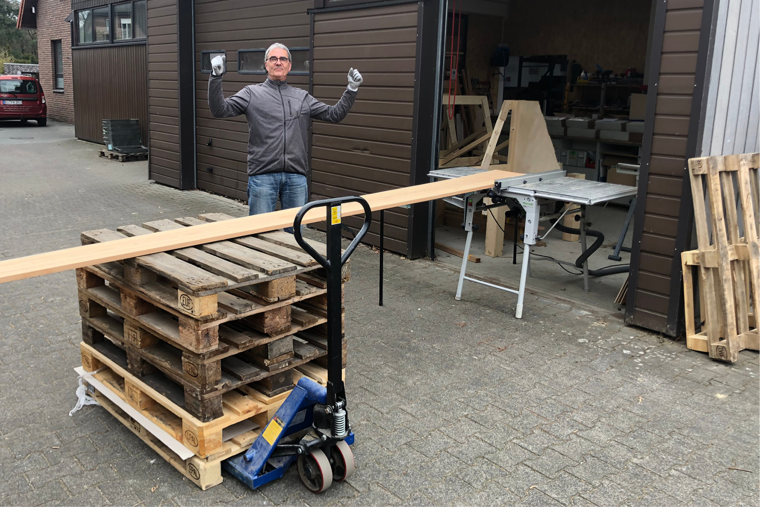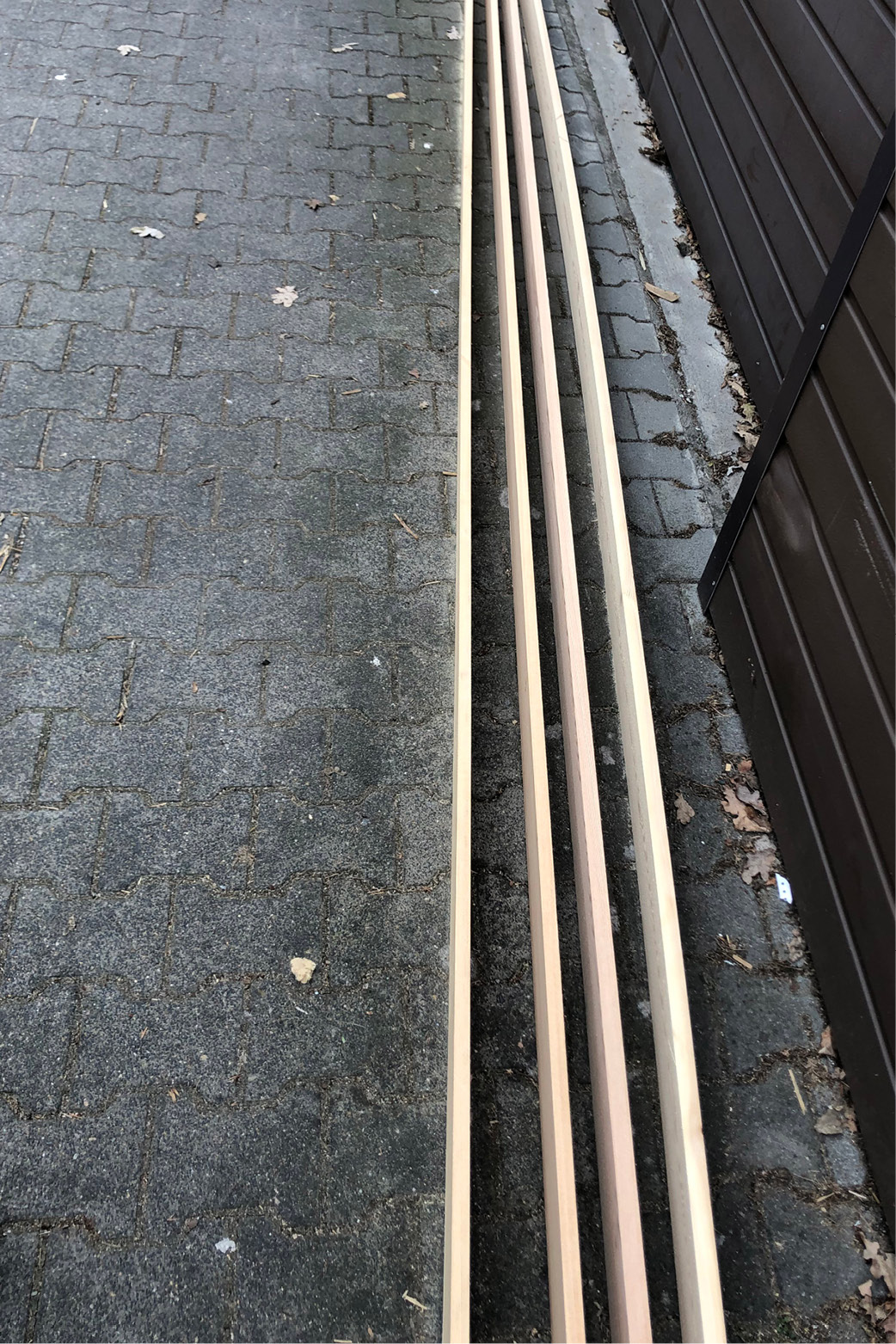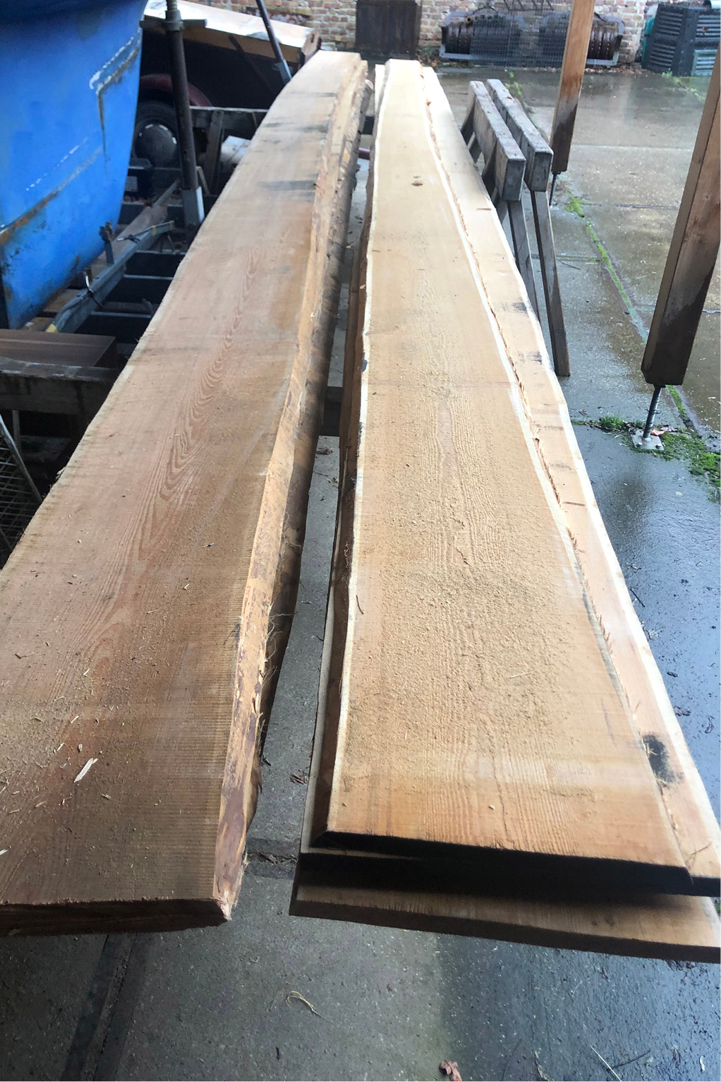 Lärche sieht toll aus. Geliefert wurden ca 25mm dicke Bretter, die den Stamm abbilden. Ich dachte, daß muß ich da irgendwie drandängeln. Weit gefehlt....erst wird noch gehobelt und dann das Holz aufgeschnitten....siehe Teileliste. Und lang sind die Dinger ....ca 550 cm. Einfach mal ins Auto legen ist da nicht ganz so einfach....