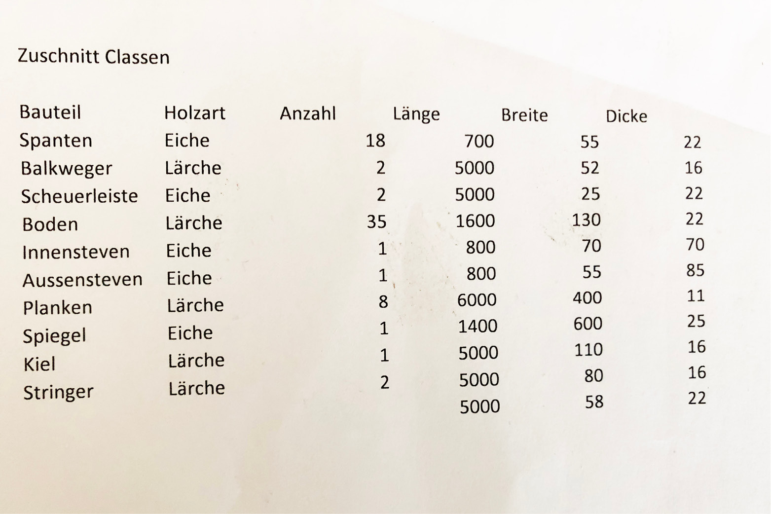 In den gekauften Plänen war u.a. Eiche für die Spanten,Stringer, Steven, etc. vorgegeben, ansonsten "Pine", also Kiefer. Hier kommt wieder der Bootsbauer, Herr Rogozinski, auf den Plan. Er schlug Lärche vor und hat sie entsprechend organisiert. Ich bzw. er hat das Holz hierher: