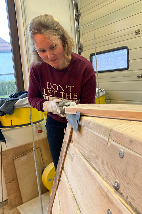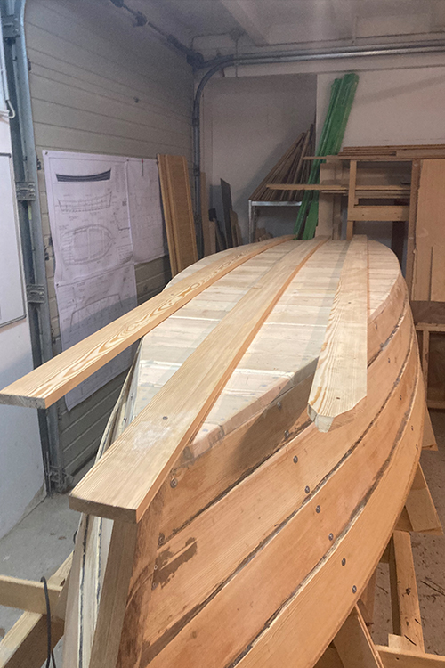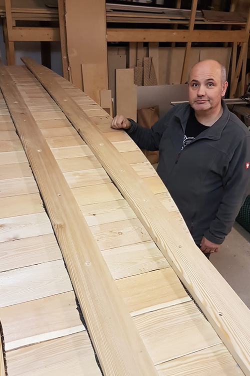 Also der Steven ist mehr oder minder fertig....feinschliff folgt bald. Kalfatern entfällt ja quasi, dazu gibt es ja die Dichtmasse. Und geschliffen hab ich schon was, aber das wird immer wieder mal gemacht. Also fertig ? Nein, eine wichtige Übung kommt jetzt: das Drehen des Bootes. man schraubt die Mallen vom Tisch, dann hebt man das Boot runter und dreht es. Dann werden wir die Beine vom Tisch entfernen und das Gerüst auf den Boden legen...vorne und hinten noch ein Brett drunter...fertig ist die Helling (sowas wie ein Trockendock) !